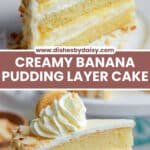 7. Assemble Cake Layers: Place the first cake layer on your cake board or serving plate. Pipe a thick outline of vanilla frosting around the edge to form a barrier. Fill the center with piped banana pudding. Repeat this process with the second cake layer.