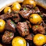 Look for beef labeled “stew meat” in your butcher’s case — it’s often the perfect size. If you can’t find baby Yukon gold potatoes, small red potatoes make a tender stand-in. When buying fresh garlic, choose bulbs firm to the touch with no sprouts. Butter quality matters too—go for unsalted if you want to control salt levels, or salted for richer flavor. And if you’re in a pinch, garlic powder can slightly increase but fresh garlic really makes this dish sing.