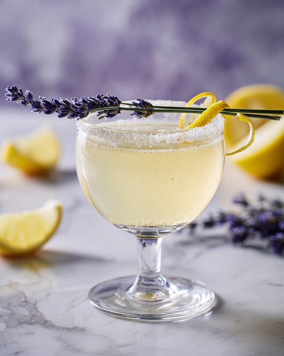 - Garnish: Add a fresh lavender sprig or a lemon twist as a garnish to enhance the cocktail’s aroma and presentation, then serve immediately.