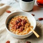 This Slow Cooker Pumpkin Pie Oatmeal is a comforting, hearty breakfast perfect for fall mornings. Made with steel-cut oats, creamy almond milk, and pumpkin puree, it’s lightly sweetened with maple syrup and spiced with pumpkin pie spice and cinnamon. Simply set it and forget it in your slow cooker overnight for a warm, nourishing start to your day. Top with chopped pecans, extra maple syrup, and a splash of almond milk for added texture and flavor.